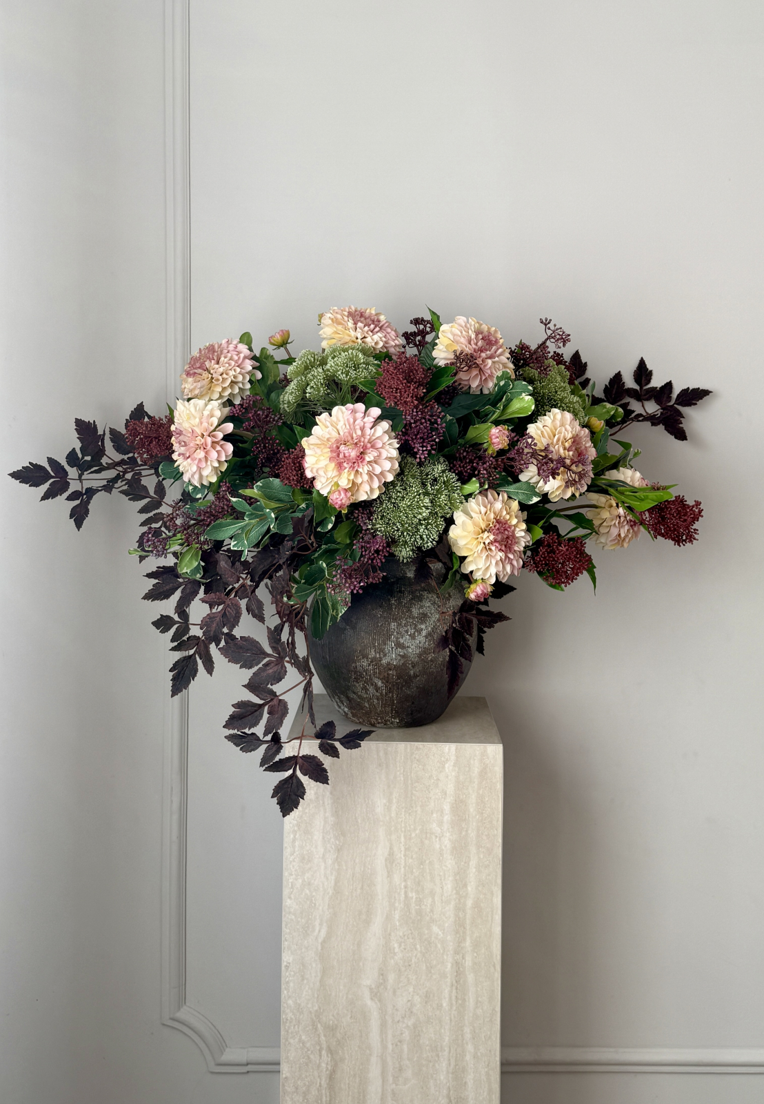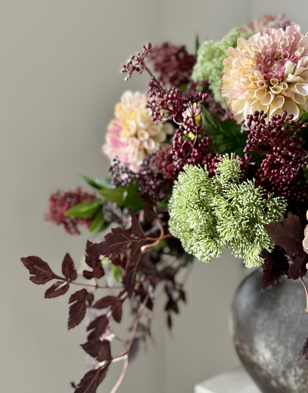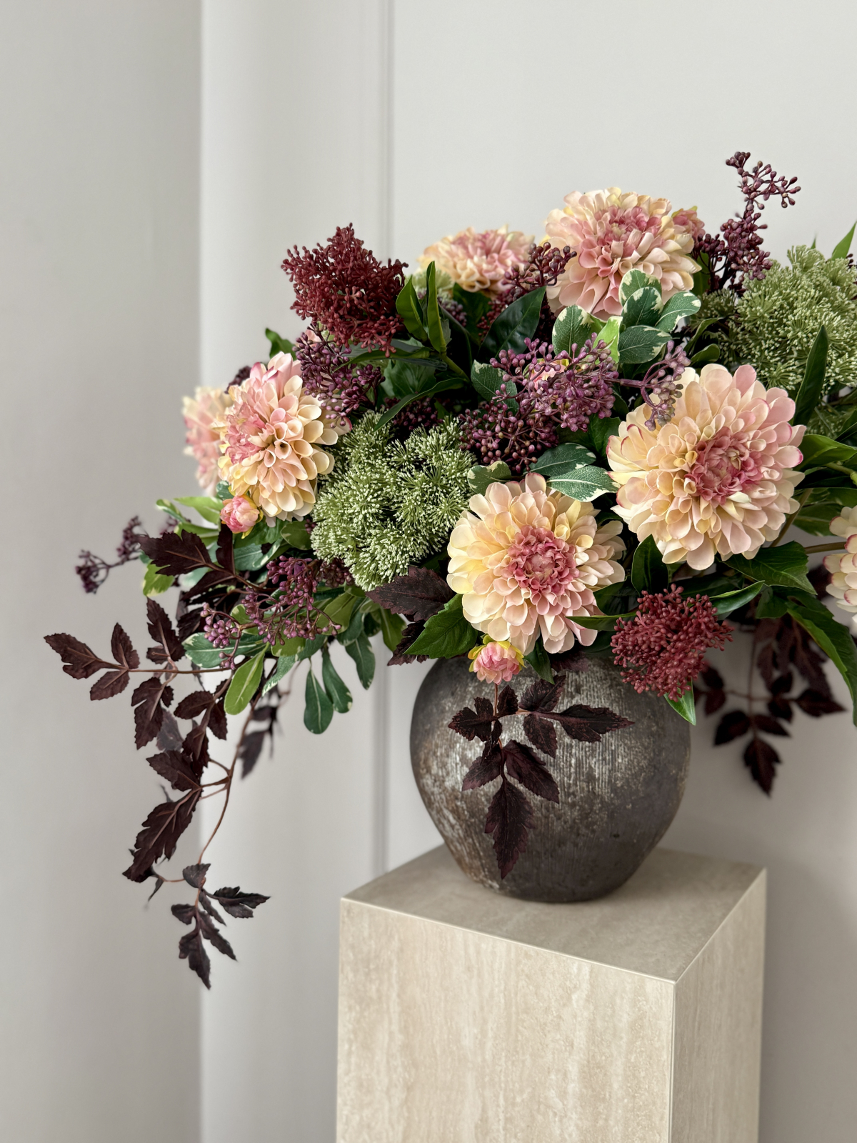 Autumn este un aranjament de toamnă așa cum o vedem noi: caldă, bogată, plină de texturi și nuanțe care te inspiră. Un mix elegant si voluminos de flori artificiale premium – dalia pink, cimicifuga, skimmia, pittosporum, burgundy berries și allium – atent alese pentru a aduce în spațiul tău un strop de natură și rafinament.