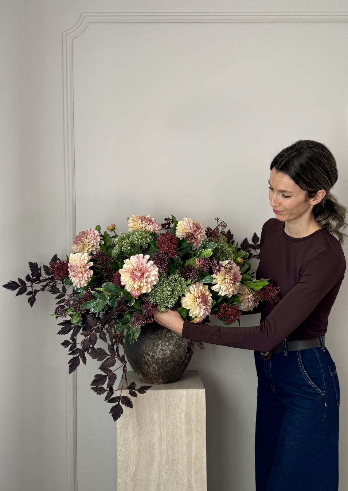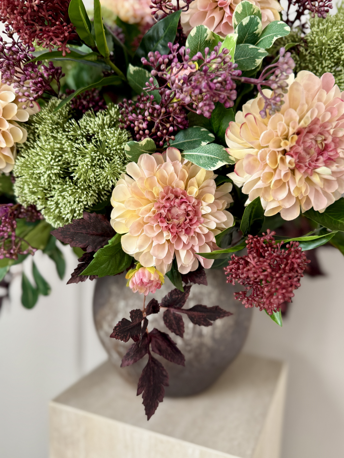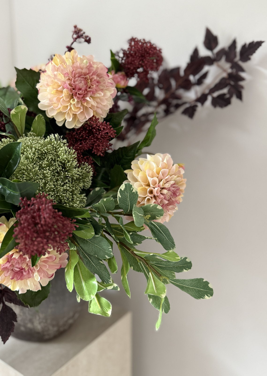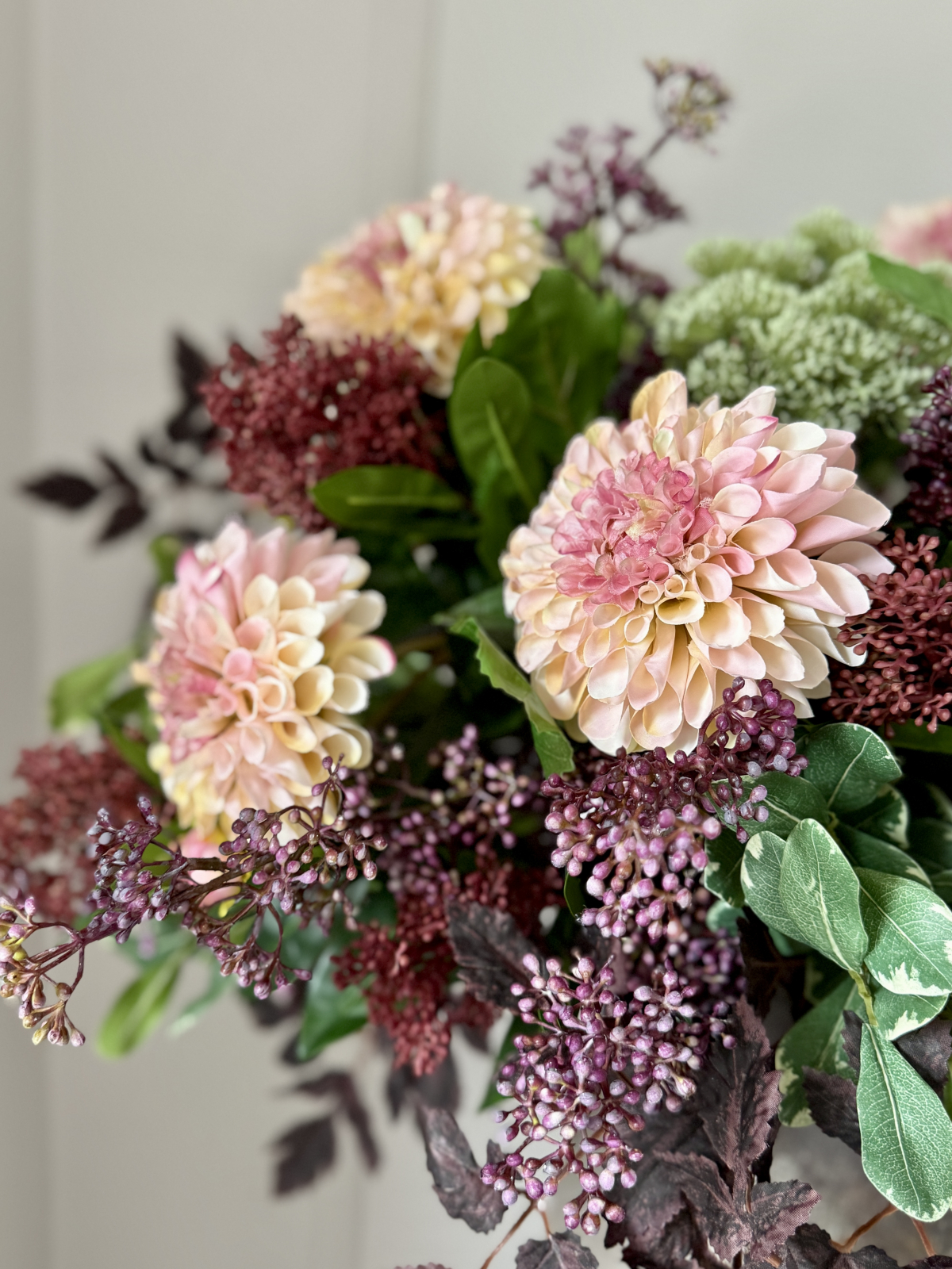 Autumn este un aranjament de toamnă așa cum o vedem noi: caldă, bogată, plină de texturi și nuanțe care te inspiră. Un mix elegant si voluminos de flori artificiale premium – dalia pink, cimicifuga, skimmia, pittosporum, burgundy berries și allium – atent alese pentru a aduce în spațiul tău un strop de natură și rafinament.