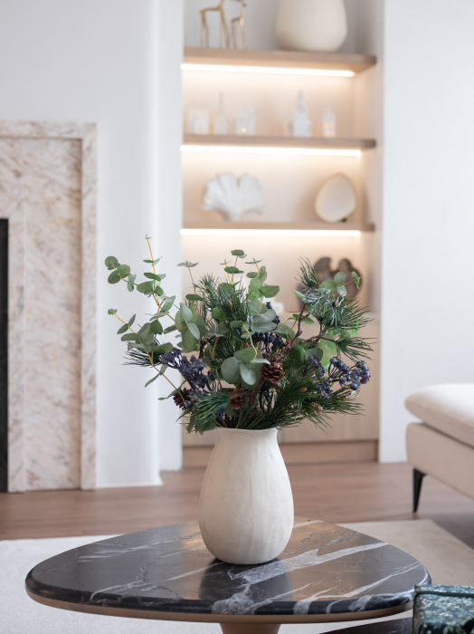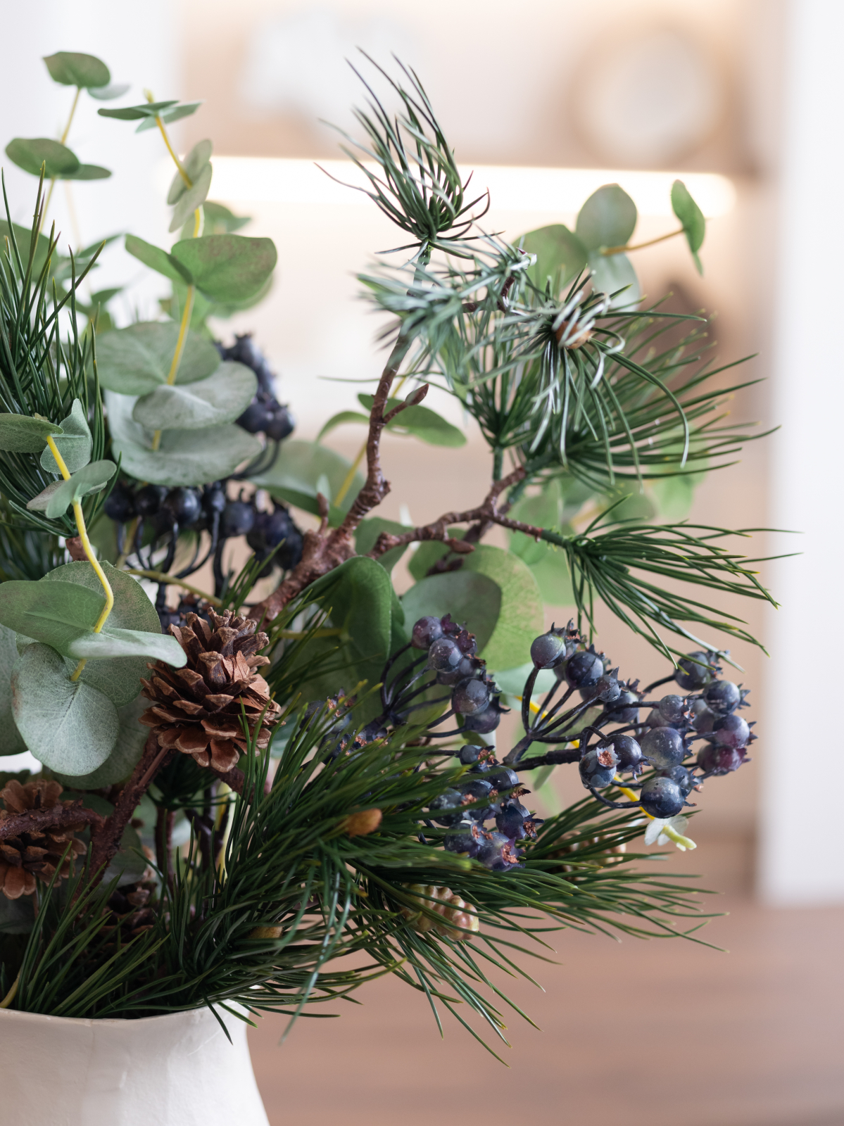 „Blue Winter” este un aranjament mic, cu un aer simpatic și relaxat. Două fire de Pin (M) Artificial , un fir de Soft Green Eucalyptus Artificial și trei fire de Blue Berries Artificial se așază împreună într-un mix delicat de texturi și nuanțe. Este un detaliu vesel și armonios, care aduce prospețime și culoare.