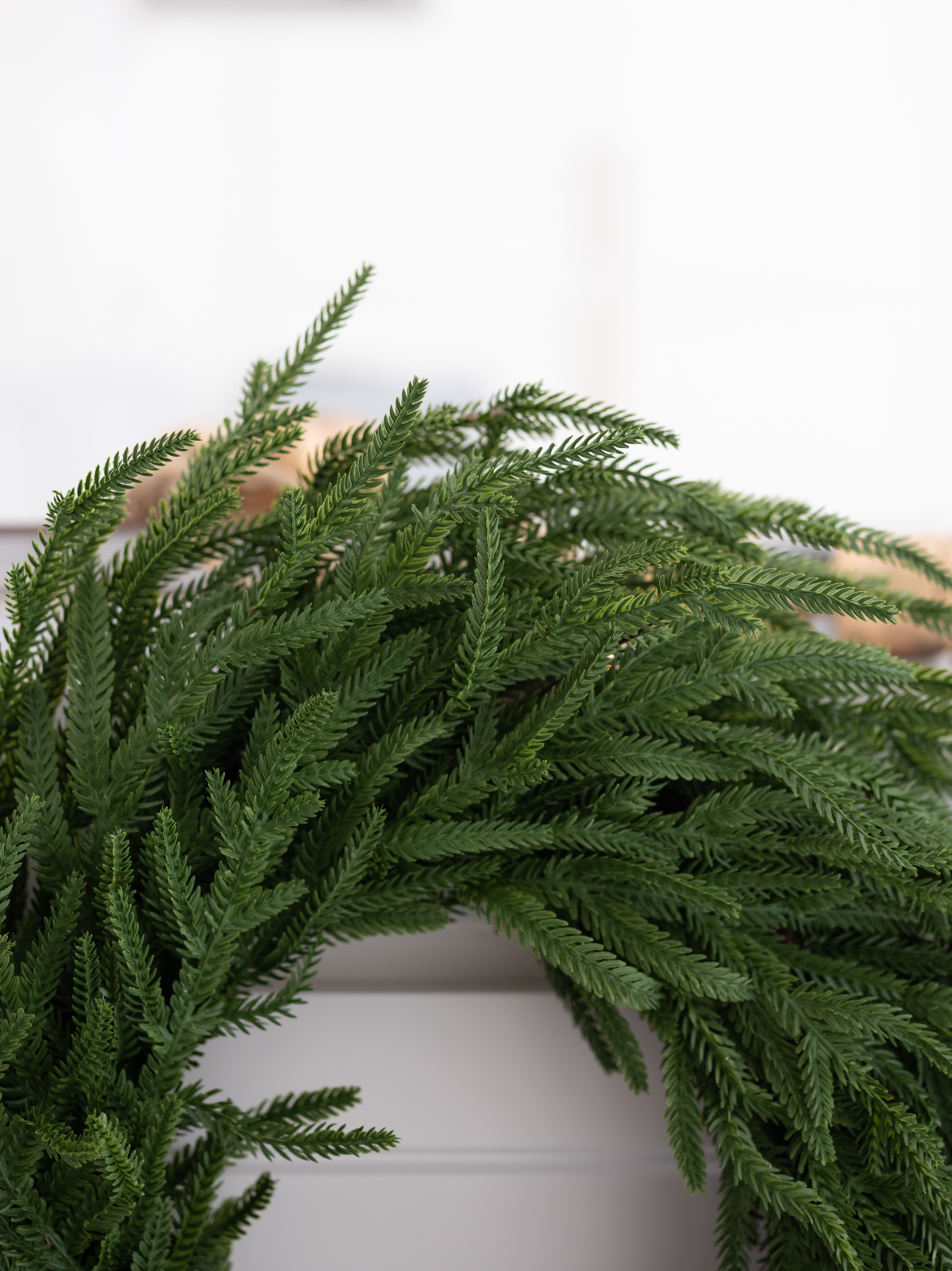 Coronița noastră din Norfolk Pin este alegerea perfectă pentru un decor de Crăciun clasic și elegant. Realizată din ramuri real touch cu aspect foarte natural și bază din ratan autentic, este o piesă versatilă și ușor de stilizat. O poți lăsa simplă pentru un look curat sau o poți accesoriza cu clopoței, funde din catifea ori alte detalii festive.