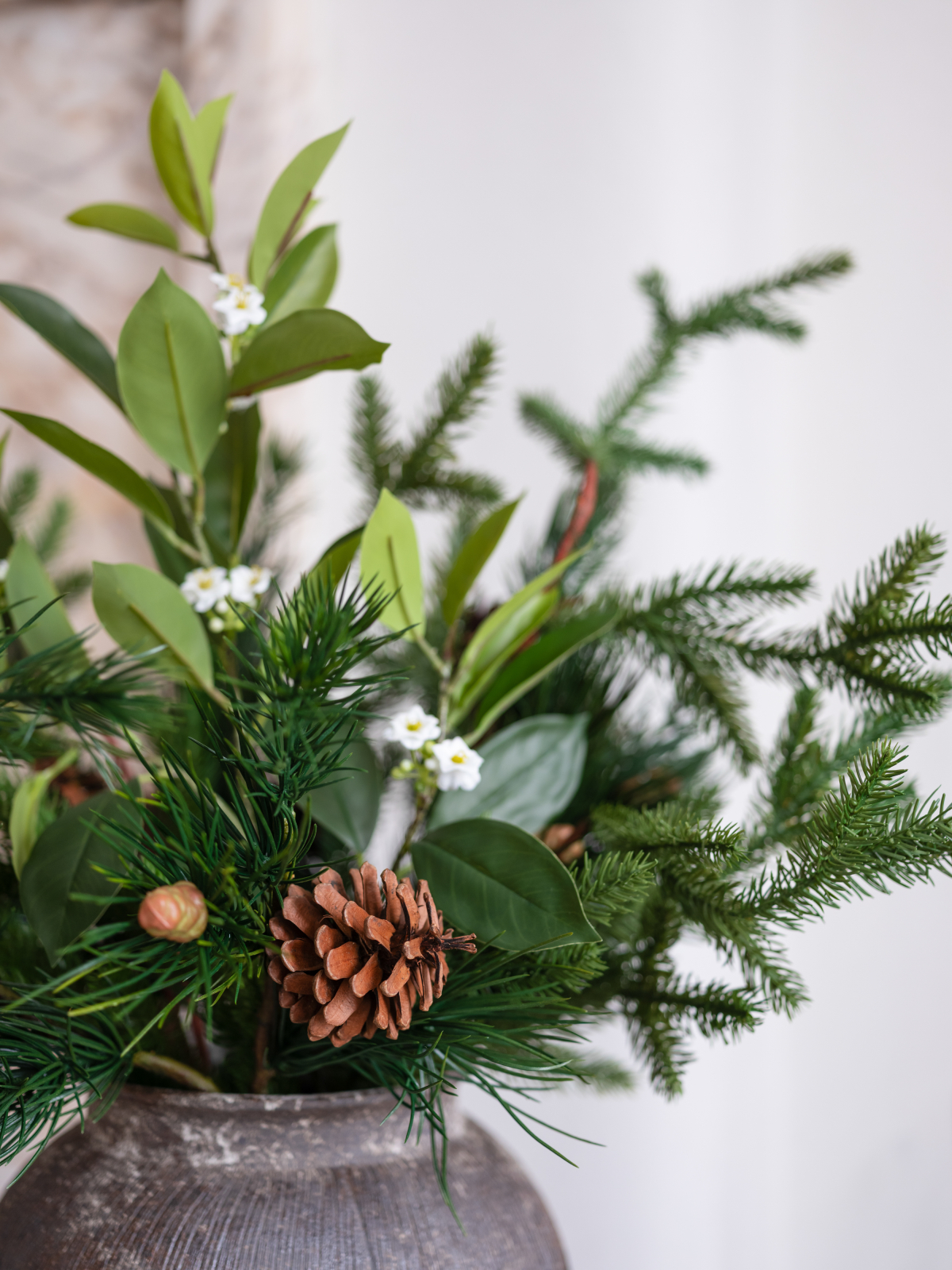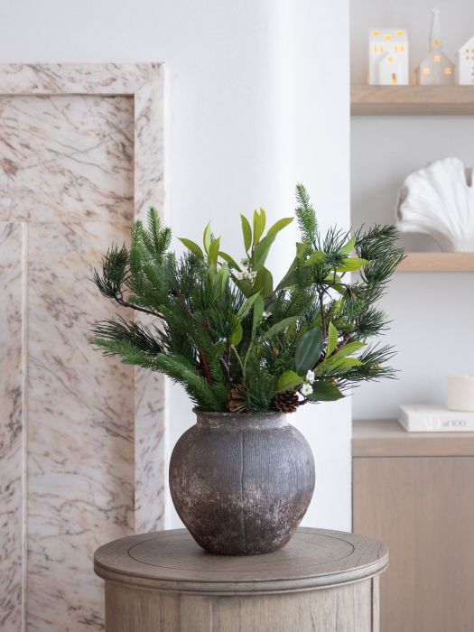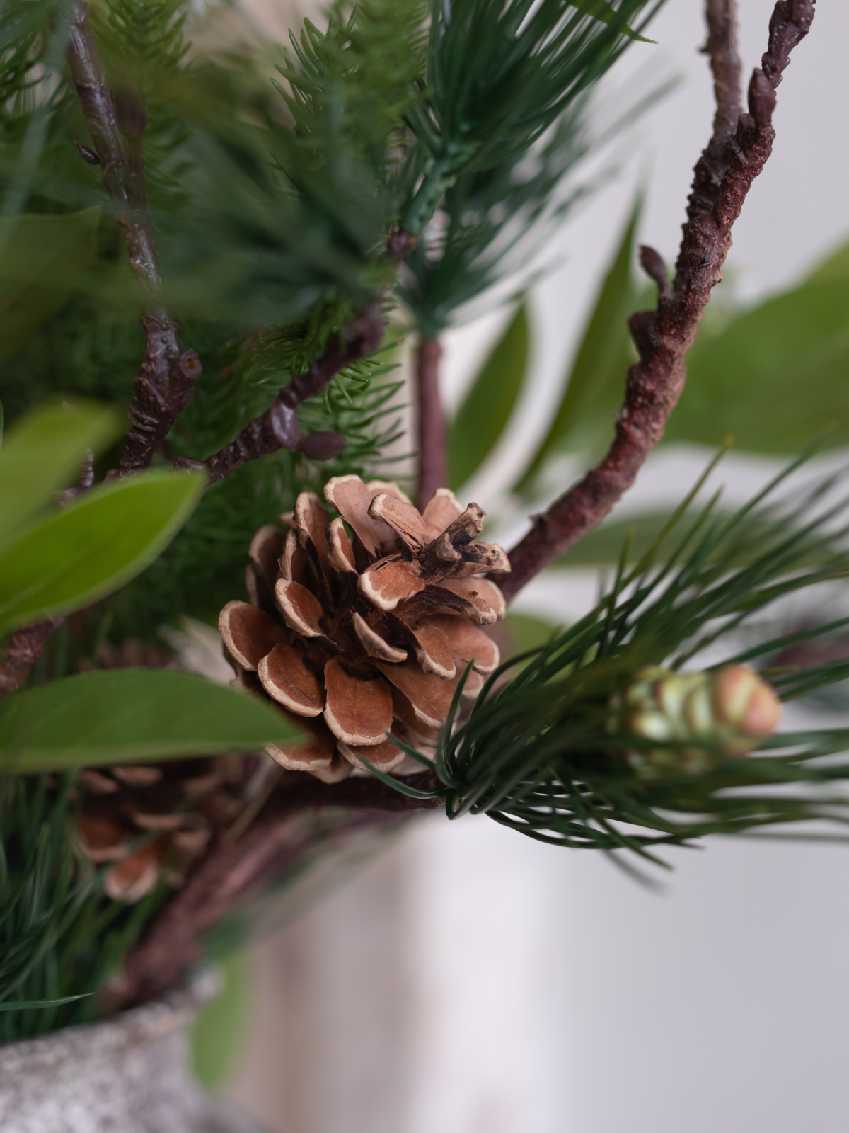 „Winter Green” este un aranjament cu un look proaspăt și curat, realizat din ramuri de Pin Artificial (L), Norfolk Pin Artificial și un singur fir de Iasomie Artificiala care aduce acea notă delicată și surprinzător de luminoasă. Deși iasomia nu este o floare de iarnă, în combinația aceasta își găsește perfect locul și dă aranjamentului un farmec aparte.